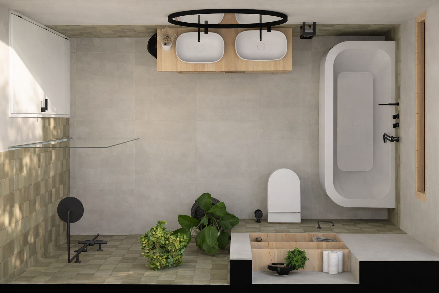 Deze badkamer is geen verzameling losse keuzes, maar één samenhangend plan. Een plek waar je de dag begint in stilte en afsluit in ontspanning.