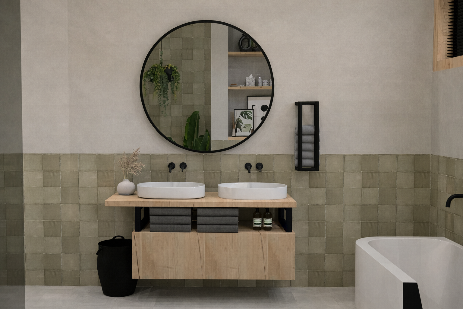 De ronde spiegel doorbreekt de strakke lijnen en voegt een zachter element toe. Donkere accenten in het kraanwerk en de douche geven contrast en zorgen voor een moderne, krachtige uitstraling.
