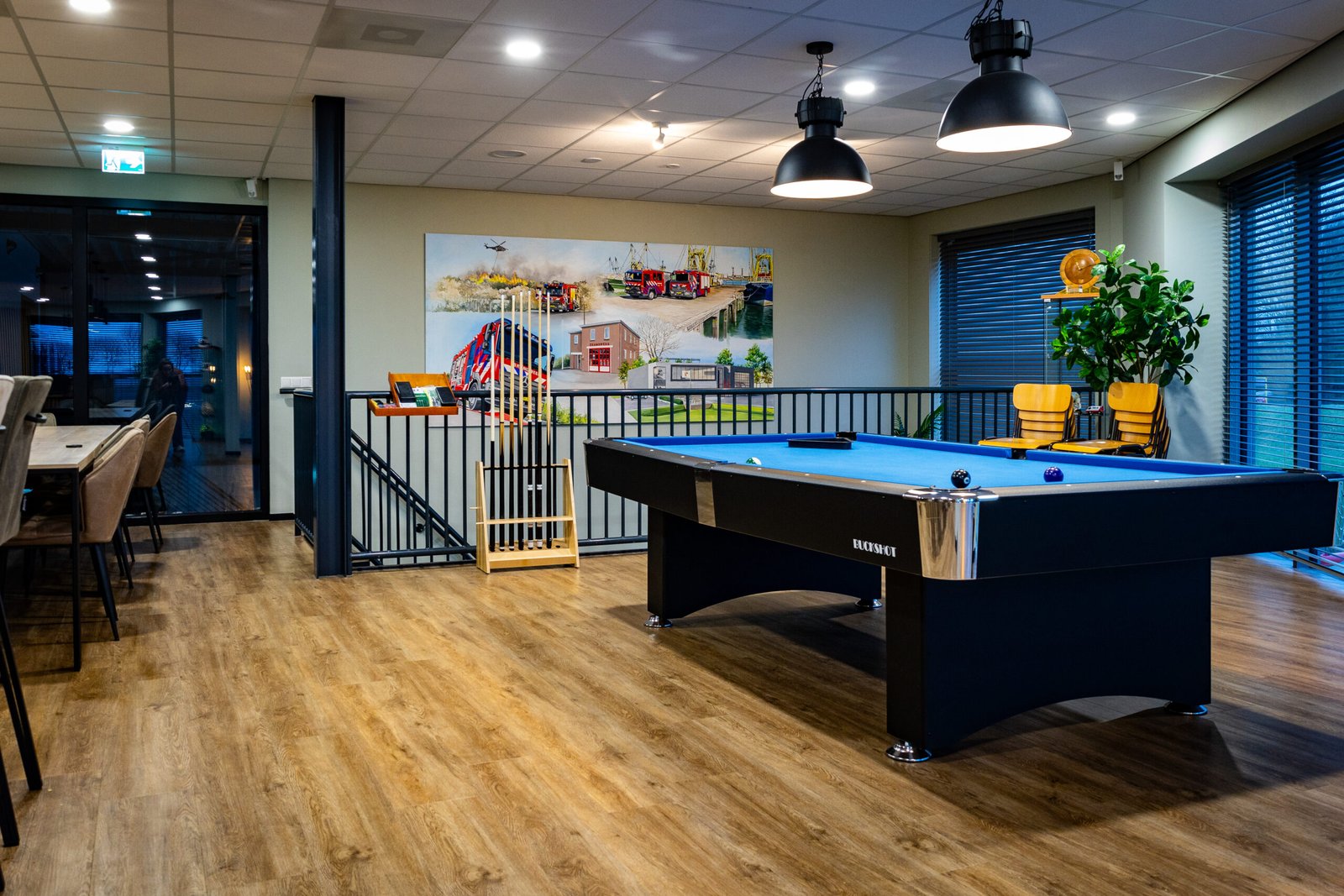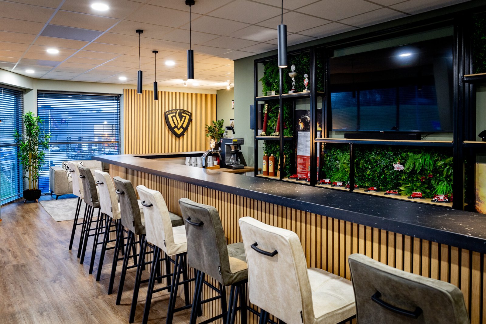 Het instructiegedeelte kreeg een duidelijke positie met lange tafels en goede zichtlijnen richting presentatiepunt. De bar vormt het sociale hart van de ruimte. Het woongedeelte is bewust wat zachter en intiemer ingericht, zodat er ook ruimte is voor ontspanning na een inzet.
