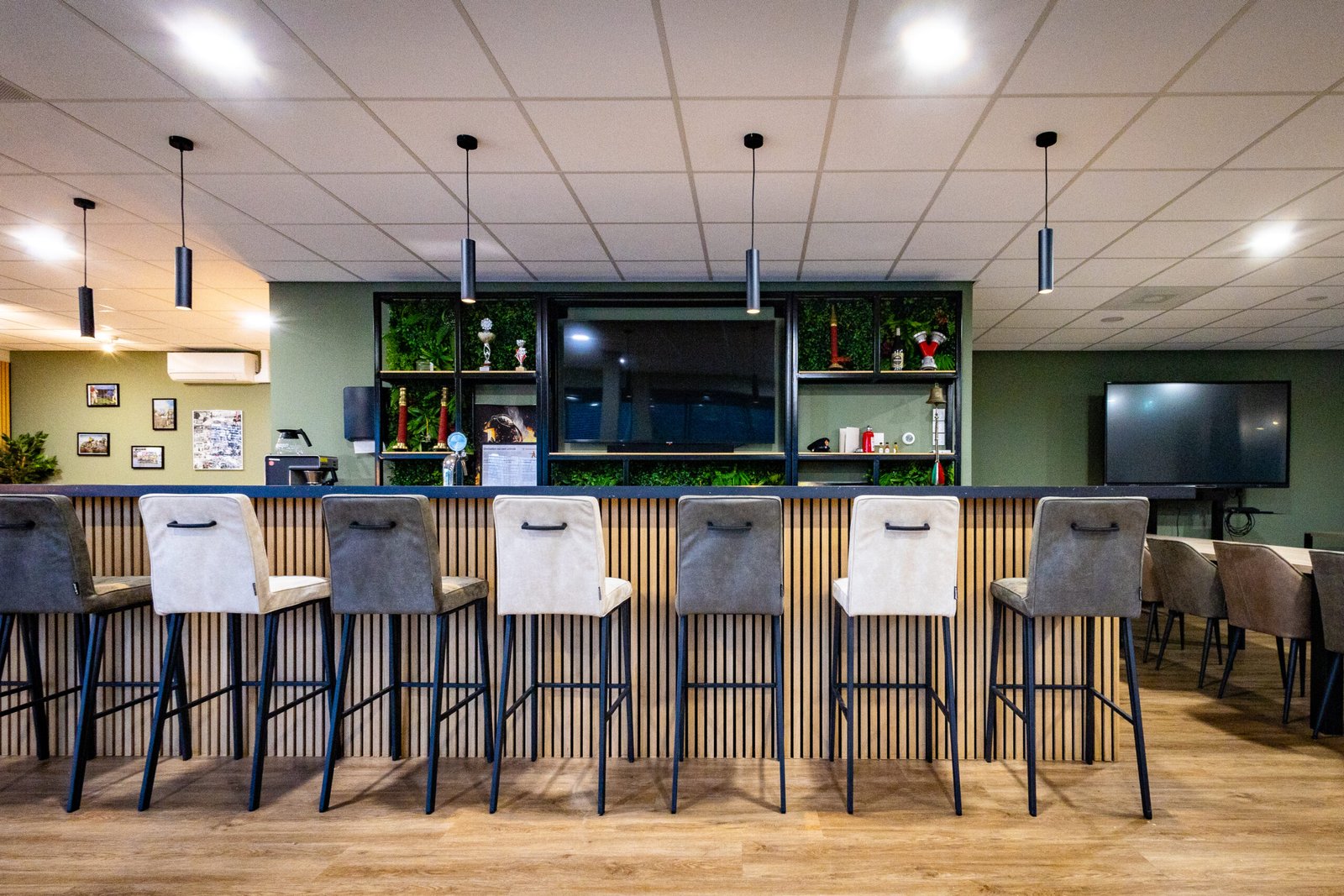 De groene wand bij de bar brengt diepte en karakter. De lattenstructuur en het donkere blad geven de bar een sterke uitstraling, terwijl hout en zachte stoffen zorgen voor balans.