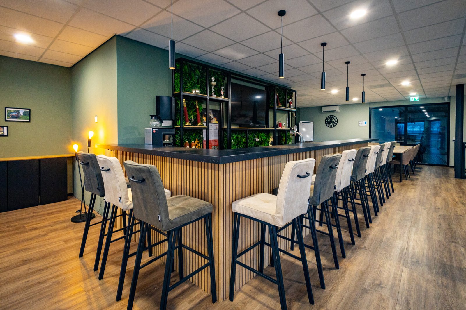 Overdag is de ruimte helder en functioneel, geschikt voor instructies en overleg. In de avond zorgt warmere verlichting boven de bar en in het zitgedeelte voor een andere sfeer.