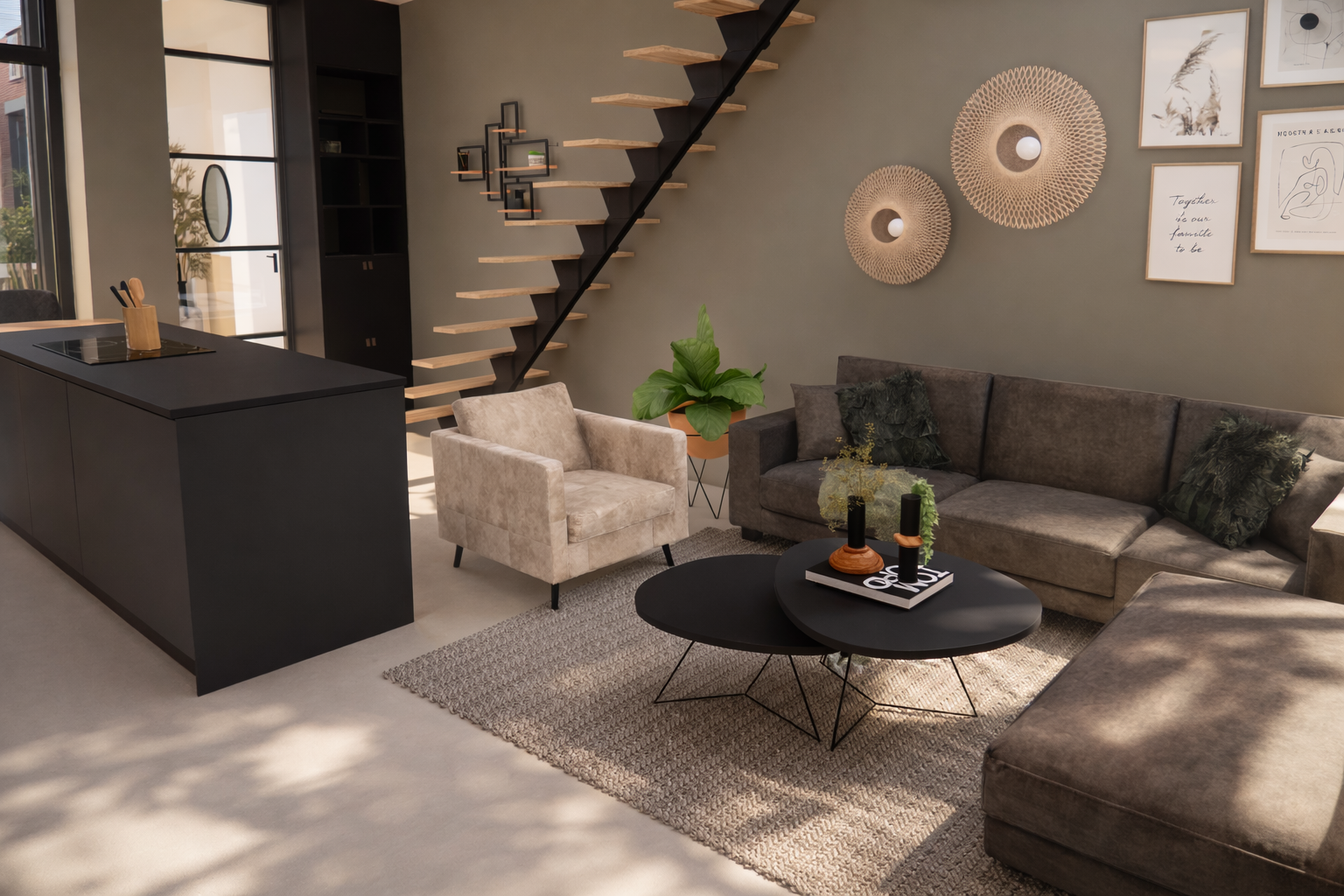 Vanuit die gesprekken ontstond een duidelijke richting: een rustige basis met aardse tinten, natuurlijke materialen en zachte structuren als tegenhanger van de hardere nieuwbouwmaterialen zoals beton en staal. Juist in een moderne woning is het belangrijk om balans te creëren tussen strak en warm.