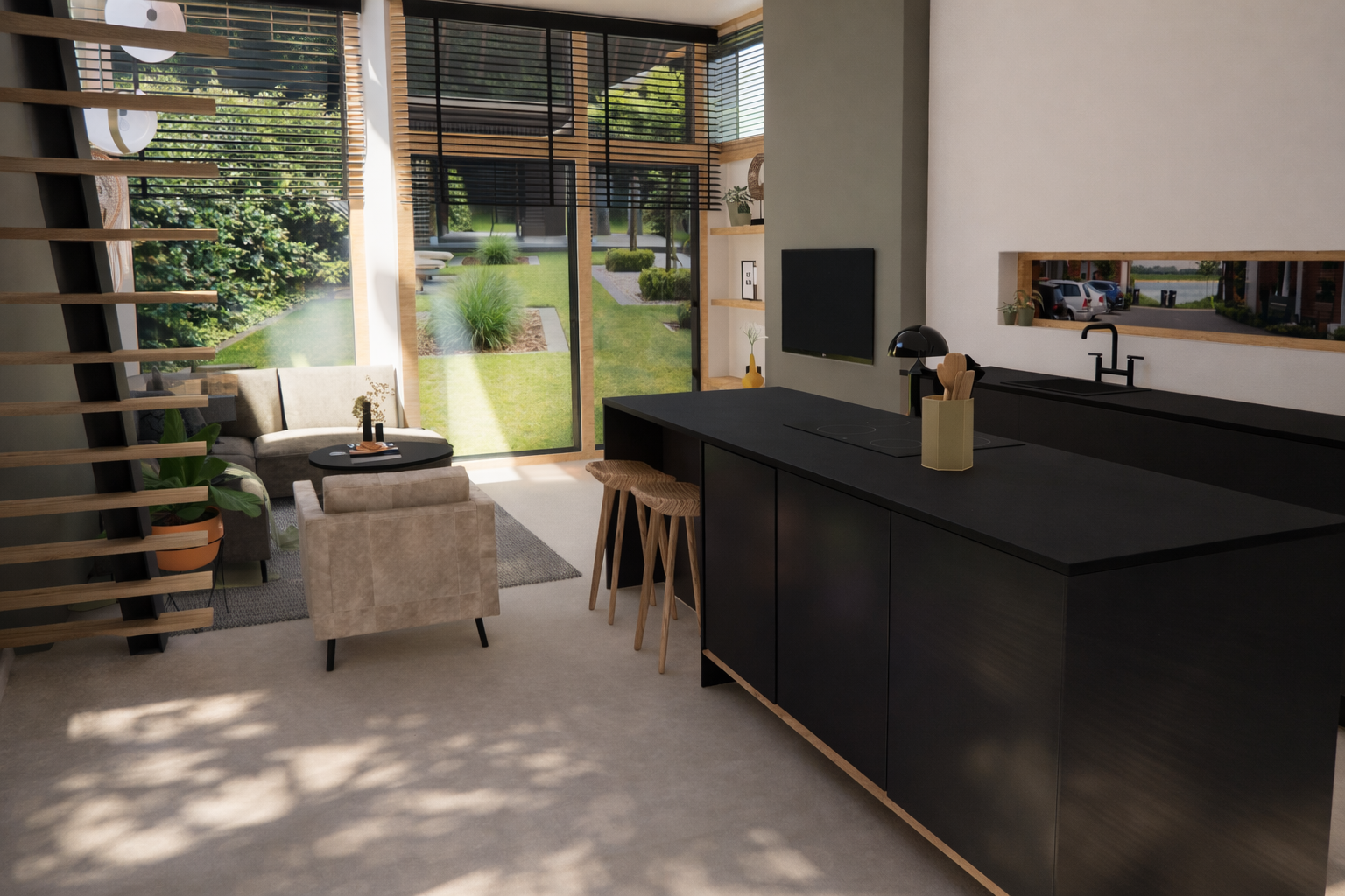 Met 2D- en 3D-visualisaties heb ik het ontwerp volledig inzichtelijk gemaakt. Zeker bij een nieuwbouwwoning, waar alles nog leeg en abstract is, helpt het enorm om te zien wat kleur, indeling en materiaal daadwerkelijk doen met de ruimte.