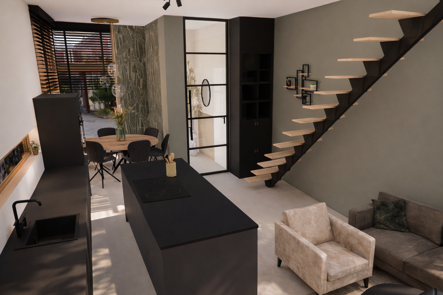 Zwarte accenten zorgen voor contrast en geven het interieur net dat beetje kracht dat past bij de industriële ondertoon. Zo ontstaat een spanningsveld tussen zacht en stoer — precies waar deze stijl om vraagt.