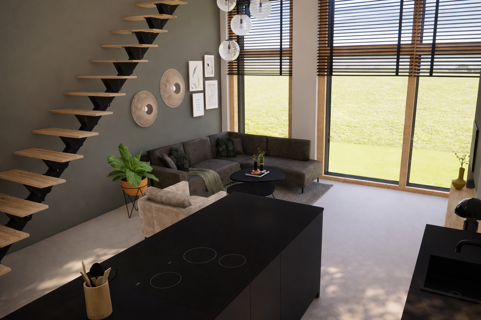 In de zithoek heb ik gekozen voor een royale hoekbank in een warme groentint, uitgevoerd in een zachte stof die uitnodigt om neer te ploffen. Een comfortabele fauteuil in een vergrijsde tint voegt extra zitruimte toe zonder het geheel te domineren.